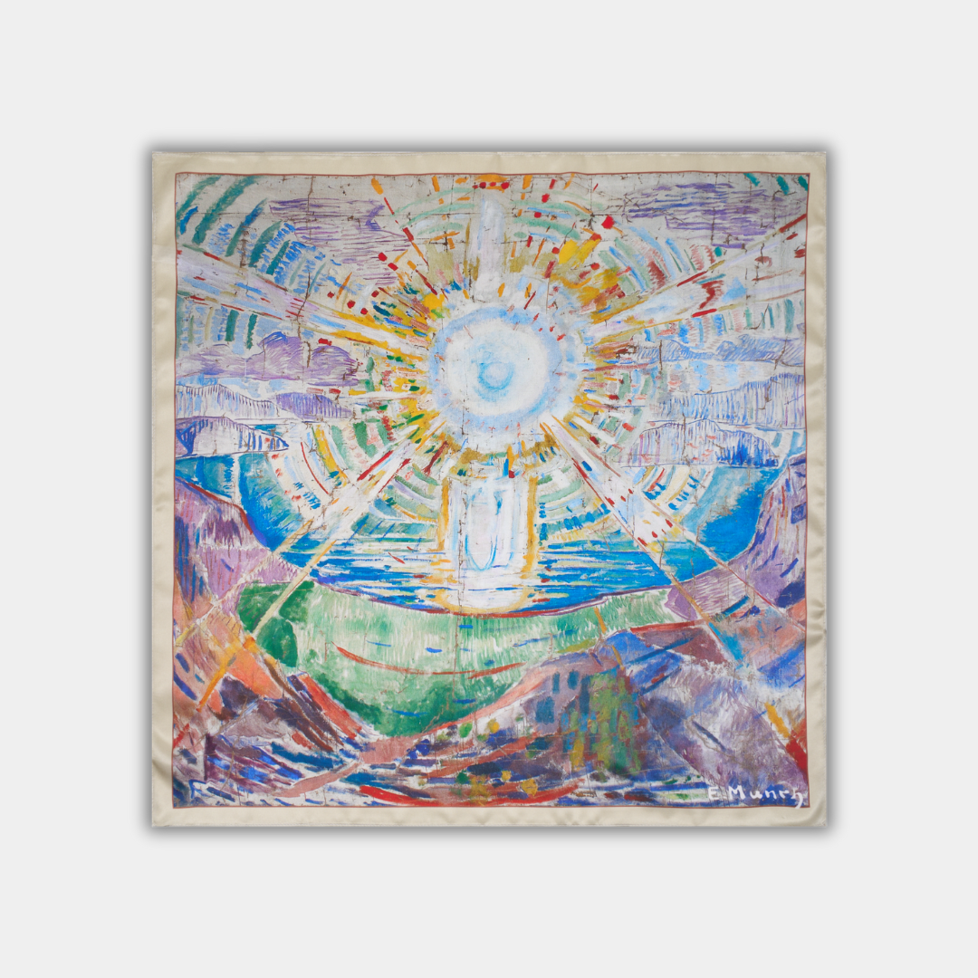 Le design de ce foulard en soie s’inspire de l’œuvre d’Edvard Munch Le Soleil. Huile sur toile. Norvège, 1911.
