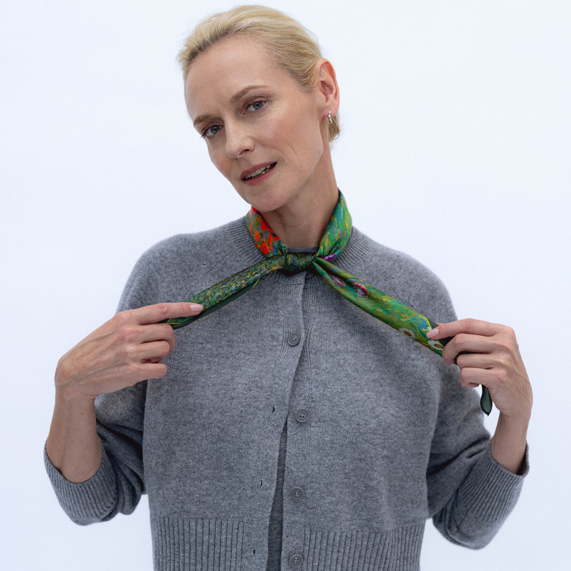 Le design de ce foulard en soie s’inspire de l’œuvre de Gustav Klimt Le Jardin de la maison. Huile sur toile. Autriche, 1911.