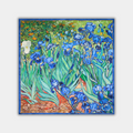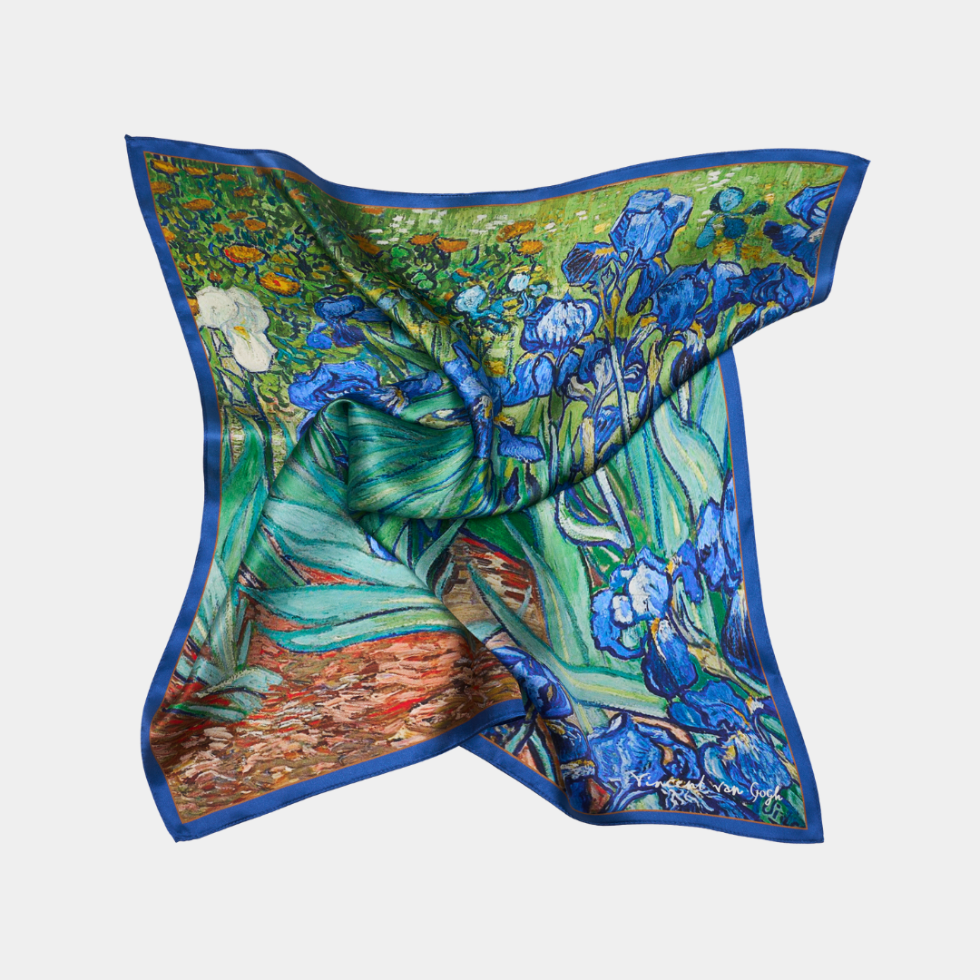 Le design de ce foulard s’inspire de l’œuvre Les Iris de Vincent van Gogh (huile sur toile, France, 1889).