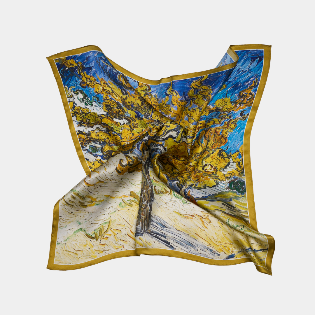 Le design de ce foulard s’inspire de l’œuvre Le Mûrier de Vincent van Gogh (huile sur toile, France, 1889).